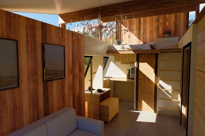Vivienda tiny house prefabricada con MulchPanel, pensada para quienes buscan mayor amplitud y una experiencia de habitar más definida. Cuenta con un dormitorio en altillo y un primer nivel integrado de estar, cocina y comedor. Su diseño garantiza confort térmico y acústico durante todo el año, optimizando el uso del espacio y costos operativos, con posibilidad ampliación.